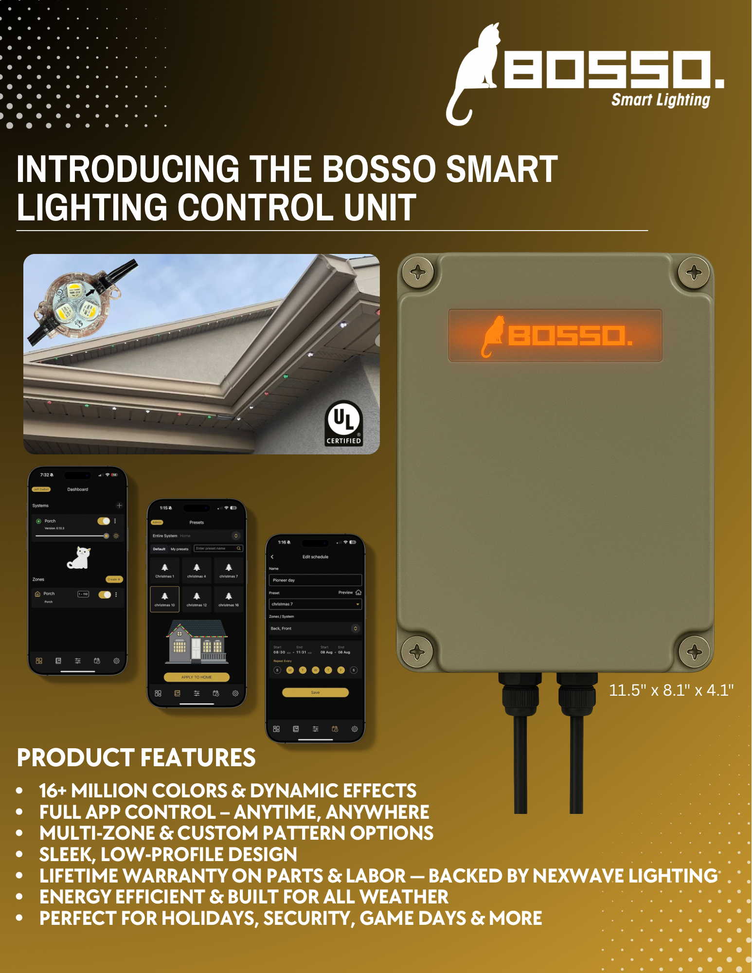 This rugged, weatherproof control unit is your gateway to full-spectrum lighting mastery. Built to blend seamlessly into your garage or any Wi‑Fi‑connected space, it's UL-rated and UO-rated for durability and safety. From the intuitive Bosso mobile app—available on iOS and Android—you can manage your entire lighting system from anywhere. Choose from over 16 million colors, schedule lighting, activate presets, or design your own scenes. The controller supports up to 8 separate lighting zones per unit, and you can link up to 4 units under one account for full-home coverage